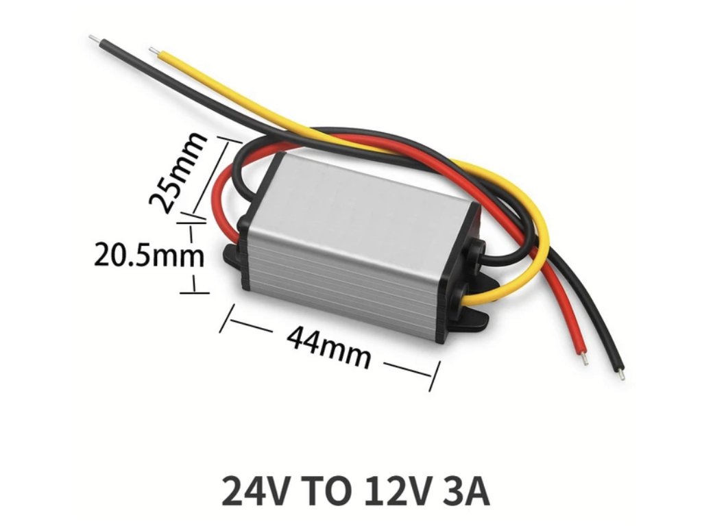 Vstupní napětí: 24V (s možností vstupu od 15V do 40V) Výstupní napětí: 12V Maximální proud: 3A (což odpovídá 36W výkonu) Účinnost konverze: 90% Teplotní odolnost při plném zatížení: 50 stupňů CelsiaDoplňkové parametry