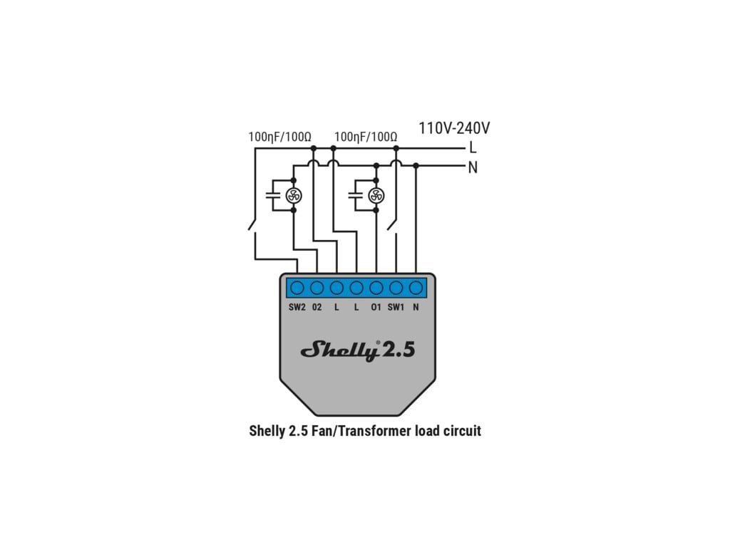 Obvody pohlcující energii se používají k potlačení napěťových špiček způsobených indukčností obvodu při otevření elektrického nebo mechanického spínače. Používá se pro všechna relé Shelly, která se restartují při zapínání indukčních zátěží, jako jsou ventilátory, motory, válce nebo ta, která způsobují napěťové špičky při zapínání. RC snubber by měl být zapojen mezi výstup a neutrál obvodu. Specifikace